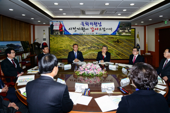 경주시가 연초부터 2015년도 국비예산 확보에 총력을 기울이고 있는 가운데 시정 주요현안과 국가지원사업의 원활한 협조를 이끌어 내기 위해 지난 5일 시청 대외협력실에서 정수성 국회의원을 초청하여 시정보고회를 개최하고 사업의 필요성과 예산확보의 당위성을 설명하면서 적극적인 지원을 요청했다.