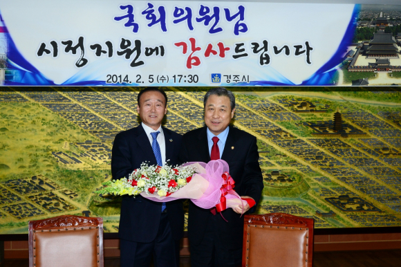 이날 보고회에서 최양식 시장은 경주동궁원 개장 등 전년도 주요사업 성과를 설명하고, 국비예산이 반영될 수 있도록 도와준 것에 대하여 감사의 말을 전하면서, 정부의 문화융성 기조에 맞추어 공약사업으로 추진중인 신라왕궁 복원사업 등 현안사업을 설명하고 국비예산이 확보될 수 있도록 국회의원이 적극적인 관심을 가져 줄 거듭 당부했다.