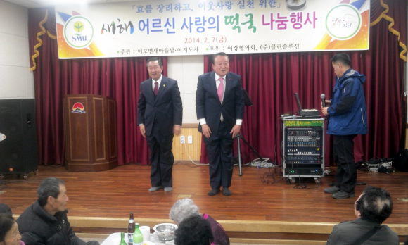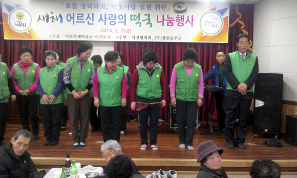 김천시 어모면새마을남여지도자(회장 김창집, 박희숙)는 지난 7일 어모면사무소 회의실에서 희망찬 갑오년 청마의 해를 맞이하여 관내 65세 이상 노인 250명을 초청하여 새해 사랑의 떡국 나눔 행사를 가졌다. 박보생 김천시장, 허동찬 김천부시장, 강인술 시의원, 박운용 어모면장, 이재화 노인회장, 차호성 이장협의회장, 정홍재 어모파출소장등 많은 기관단체장이 참석해 어르신들에게 세배를 드리고, 수고해 주신 새마을협의회에게 진심으로 감사하다는 말을 전했다. 이번 떡국 행사는 어모면 새마을단체에서 지난해 재활용품 판매금등 수익금과 관내에 소재하는 기업체인 ㈜클린솔루션과 이장협의회에서 협찬으로 최근 어려운 경제 여건 속에서도 지역주민과 함께하는 공동체 정신을 발휘했다.
