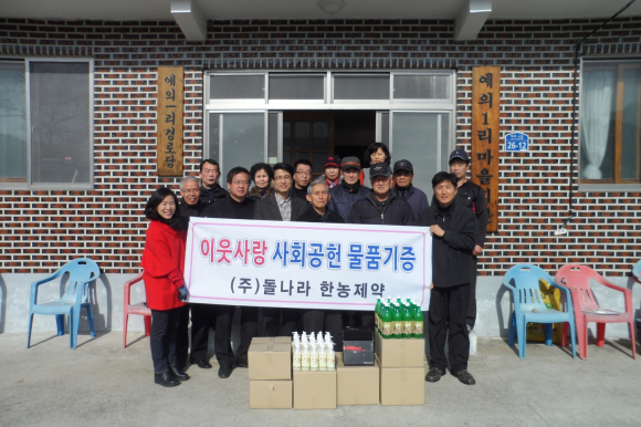 (주)돌나라 한농제약(대표이사 정석동)에서 13일 외서면 예의1리 마을회관을 찾아 120만원 상당의 유기농 생필품인 효소액 등 3종세트 20세대분을 기증했다.