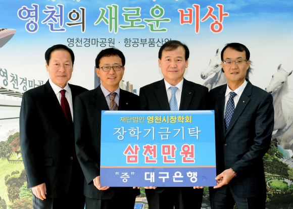 ㈜대구은행은 2009년부터 매년 3,000만원의 장학기금을 지역인재를 위해 재)영천시장학회에 출연하고 있다. 김영 경북미래본부장과 관계자들이 시청을 방문하여 올해도 그 약속을 이어가고 있다. 김영본부장은 “대구은행에 대한 지역사회 주민들의 성원에 보답하고 기업이익을 사회 환원하여 보다 의미 있는 곳에 쓰였으면 하는 마음에 올해도 장학금을 기탁하게 되었다. 장학금이 지역의 교육발전에 큰 디딤돌이 되길 바란다.”고 소감을 말했다.