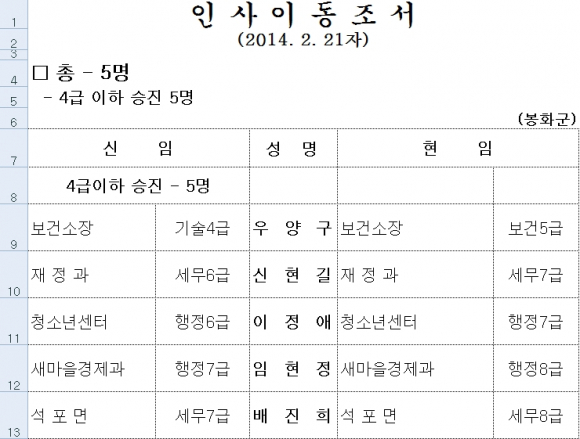 봉화군 인사이동 현황