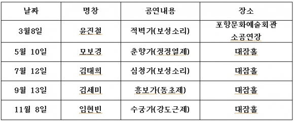 올해 지음 첫 공연은 3월 8일 오후 5시 30분 윤진철 광주시립극단 예술감독이 보성소리 적벽가를 조용수 고수와 함께 공연하고, 사회 및 해설은 포항시장 예비후보로 나선 이재원 원장을 대신해 전통문화콘텐츠 기획자인 한덕택 운현궁 예술감독이 맡을 예정이다.