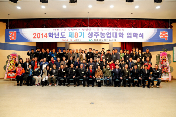 상주시농업기술센터에서는 4일 농업대학 신입생 67명이 참석한 가운데 안정적인 농업소득 창출과 경쟁력을 갖춘 전문농업인 육성을 위한 2014학년도 제8기 상주농업대학 신입생 입학식을 가졌다.