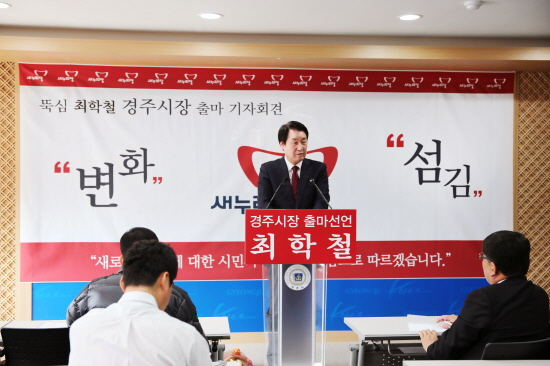 최학철 예비후보는 “지나친 독선과 오만하고 방만한 행정으로 생긴 지역적·계층적 갈등과 분열된 경주시민을 위해서 앞으로는 시민과의 소통을 통한 화합을 이끌어내어 정말 살기 좋은 경주, 행복한 도시로 만들기 위해 출마를 결심했다고 밝혔다.
