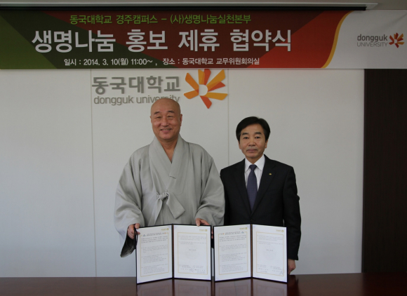 동국대학교 경주캠퍼스(총장 이계영)는 사단법인 생명나눔실천본부(이사장 일면 스님)와 지난 10일 오전 11시 교내 100주년기념관에서 한국 불교 발전과 생명 나눔 문화 확산을 위한 상호 업무 협약서를 체결했다. 이번 협약은 동국대 경주캠퍼스와 (사)생명나눔실천본부가 생명나눔으로 함께 사는 세상을 위한 상호 협력으로, 양 기관은 앞으로 장기기증 및 조혈모세포 희망등록, 자살예방 사업 등에 대한 협력, 봉사 활동처 및 봉사자 지원, 생명나눔운동 홍보 등을 지원한다. 이계영 동국대 경주캠퍼스 총장은 “생명을 나누고 살리는 일은 불교 정신과 본교 건학이념의 실현”이라며 “앞으로 생명나눔 문화 확산을 위해 적극 홍보하며 동참할 것”이라고 말했다. (사)생명나눔실천본부 이사장 일면 스님은 “이 세상에 생명만큼 중요한 것은 없다”며 “오늘 협약이 대한민국을 넘어 인류의 행복을 위한 생명나눔실천의 밑거름이 되길 바란다”고 말했다. (사)생명나눔실천본부는 1994년 설립된 보건복지부 지정 장기이식 등록기관으로 뇌사시 장기기증 희망등록, 조혈모세포 희망등록, 환자돕기 사업, 자살예방센터 운영 등 국민의 건강과 복지를 위해 노력하고 있다.