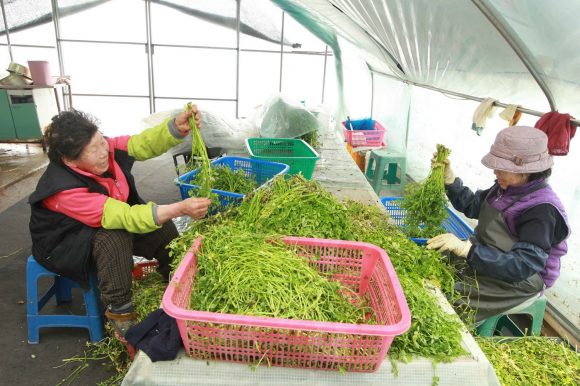 1월말 경 첫 출하를 시작으로 4월말까지 수확이 가능하며, 청정 자연환경을 바탕으로 생산된 고품질 청정 미나리는 맛과 향이 뛰어나, 소비자로부터 큰 호응을 얻고 있음은 물론, 고정 고객이 많아, 공급에 차질이 생길 정도이다.