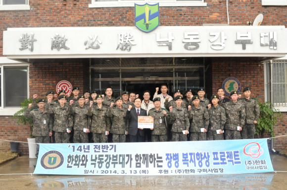 전달된 후원금과 위문품은 ㈜한화구미사업장 임직원들이 모금을 통해 사회환원사업으로 추진하고 있는 ‘밝은 세상 만들기 기금’을 활용한 것으로써 구미 국가산업단지를 비롯한 지역의 향토방위를 책임지고 있는 낙동강연대에 복무 중인 장병들의 복지향상과 복무의욕 고취를 위하여 전달했다.