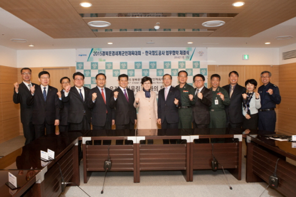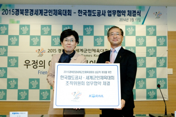 2015경북문경세계군인체육대회 조직위원회(위원장 김상기)와 코레일이 13일(목) 11시 30분, 조직위 회의실에서 대회 성공개최를 위한 업무협약을 체결했다.
