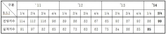 경주상공회의소는 지역 내 50여개 제조업체를 대상으로 2014년 2/4분기 기업경기전망(B.S.I)을 조사한 결과, 경주지역 기업들이 느끼는 체감경기는 전분기 B.S.I 「86」과 비교하여 13포인트 상승한 「99」로 집계되어 전분기에 비해 경기회복을 기대할 것으로 전망되었다. 이는 고용·생산 등 국내 경기 호전의 기대와 정부의 경제혁신 3개년 계획 수립에 따른 기대감이 반영된 것으로 대내적인 요인이 크게 작용하여 경기 회복에 대한 기업의 기대감이 높은 것으로 조사되었다. <표 1>