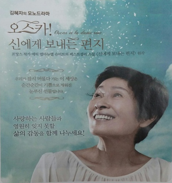 이번 공연에서는 대한민국 최고 여배우 김혜자 씨가 장미 할머니 역을 맡아 오스카의 마지막 12일간의 일상에 관해 이야기한다.