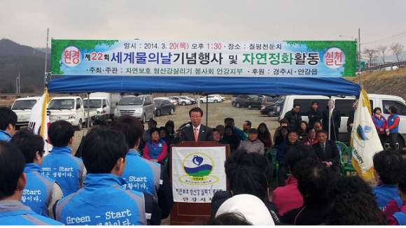 이몽희 안강읍장은 물의 날 행사를 주관한 안강읍형산강살리기봉사회에 감사의 인사를 전하고 “범시민적인 물 사랑, 물 절약 실천”과 함께 2015년 제7차 세계물포럼 행사의 성공적인 개최를 위하여 적극적인 협조를 당부했다.