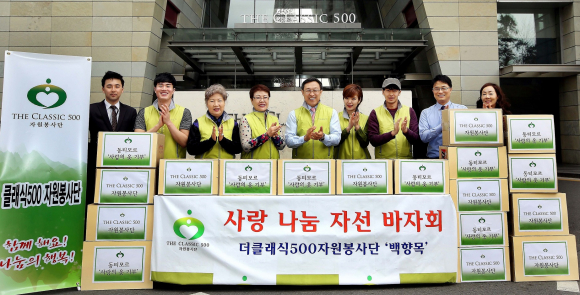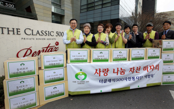 더 클래식 500 자원봉사단은 더 클래식 500 입주민과 직원들을 중심으로 사회적 공헌과 나눔을 실천하기 위해 2011년 1월 순수 사회봉사활동 단체로 결성됐다. 광진구 지역 어린이, 독거노인, 소년소녀가장, 다문화 가정을 위한 사랑의 쌀 나누기, 생필품 및 장학금 지원, 의료비 후원 등 다양한 사회봉사 활동을 해왔다. 또한 지난 12월 베트남 우물 지원에 이어 지속적으로 지구촌의 소외 이웃에게도 사랑 나눔을 실천하고 있다. 지난 4년 동안 더 클래식 500 자원봉사단이 후원한 금액은 약 1억 5천 만원 정도에 달한다.