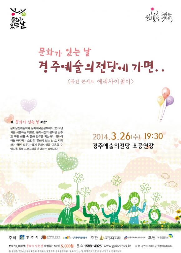 (재)경주문화재단은 정부의 문화복지 정책 중 하나인 ‘문화가 있는 날’을 기념하여 「문화가 있는 날 경주예술의전당에 가면..」이라는 특별 프로그램을 기획하고 3월 26일 수요일 그 첫 공연의 막을 올린다.