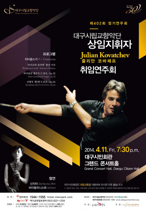 올해로 창단 50주년을 맞은 대구시립교향악단(이하 대구시향)은 카라얀의 계보를 잇는 마에스트로 ‘줄리안 코바체프(Julian Kovatchev·59·독일)’를 대구시향 제10대 상임지휘자로 맞이하고, 2014년 첫 정기연주회에 나선다. 제402회 정기연주회이기도 한 이번 공연은 오는 4월 11일(금) 오후 7시 30분 대구시민회관 그랜드 콘서트홀에서 펼쳐질 예정이다. 새롭게 선임된 상임지휘자 줄리안 코바체프와 대구시향의 첫 호흡을 확인하는 공연인 만큼 많은 이들의 높은 기대와 관심 속에 지난 3월 21일 티켓 판매를 시작한 이후 31일 현재 예매율은 약 84%(합창석 제외)를 넘어서며 조기 매진이 예상된다.