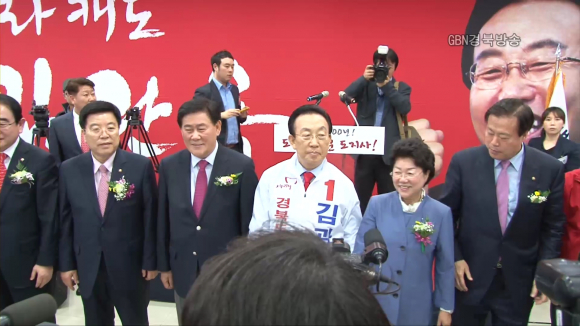 그러면서 김 후보는 “모두가 안 된다는 도청 이전을 이루어냈으며, 국비 10조원 시대를 열었고, 단식으로 1조5천억 원의 예산을 확보해 과학벨트가 가능케 했다”고 지난 8년간 도정성과를 설명했다. 또 동해안 원자력 클러스터 국책사업화, FTA 파고를 넘는 농민사관학교, 문화융성 시대를 연 이스탄불-경주 엑스포 등 일일이 열거 할 수 없을 만큼 많은 성과들이 여기 계신 국회의원과 도민들께서 헌신적으로 도와주신 덕분에 가능했다며 머리를 숙여 감사했다.