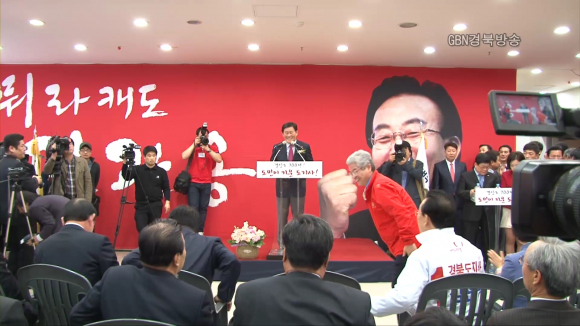 |  | | | ⓒ GBN 경북방송 | | 이 휘호는 지난 8년간 도정을 이끌면서 시작한 대형프로젝트와 도민이 행복한 경북을 위해 시작한 일들을 지사에 당선되어 이를 완성함으로써 경북이 중심이 되는 경북 세상을 도민과 함께 열어 가겠다는 꿈이 담겨 있다. |