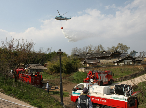 합동소방훈련은 양동마을 물봉동산에 관광객 담배꽁초에 의한 화재 발생 상황을 가상하여 화재진행 단계에 따라 ▴상황발생(화재신고) ▴자체 초동진화 ▴소방차 출동 화재진압 ▴공중․지상 합동진화 ▴화재 완전진압 ▴강평 순으로 진행됐다.