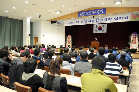 문경시농업기술센터(소장 김길태)는 2일(수) 교육생 107명(사과반 54명, 관광농업반 53명)이 참석한 가운데 2014년도 문경시 농업인대학 입학식을 가졌다. 올해 농업인대학과정은 사과반과 관광농업반으로 운영되며 사과반은 귀농자와 사과재배경력 3년 미만의 농업인을 대상으로 기초교육위주로 매월 목요일 격주로 진행되며, 특히 올해 처음 개설된 관광농업반은 현재 관광농원을 운영하고 있거나 향후 운영을 희망하고 있는 농가를 대상으로 매월 화요일 격주로 진행할 계획이다. 오늘 입학식에서는 오리엔테이션을 시작으로『창의적인 문제 해결 및 메모의 기술』이란 특강을 실시하여 농업인들에게 높은 호응을 얻었다. 관광농업반에 입학한 신주현씨는 “평소 딸기농사를 지으며 따기체험 등 지역 소비자들의 새로운 체험의 장이 되고 있지만, 전문적인 교육이 필요하다고 생각했는데, 이런 좋은 교육이 신설되어 매우 기쁜 마음으로 적극 참여할 생각이다.”라고 했다. 문경시농업기술센터는 “앞으로 농업인들의 역량 강화를 위하여 다양하고 효과적인 교육 프로그램을 개발하여 농가소득 배가를 위해 최선을 다해 노력하겠다.”고 전했다.