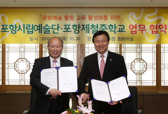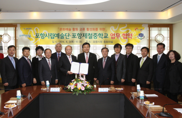 포항시립예술단은 3일 시청 중회의실에서 포항제철중학교 전인득 교장을 비롯해 관계자들 14명이 참여한 가운데 문화예술 활동을 통한 상호교류와 협력 활성화를 위해 업무협약(MOU)을 체결했다.