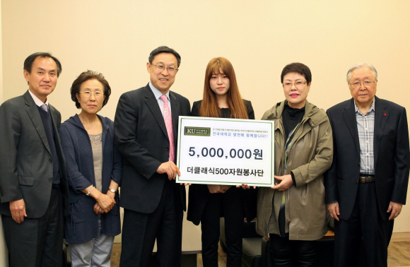 “시니어 봉사단의 사랑나눔은 계속~됩니다” - 더 클래식 500 자원봉사단, 건국대학교 성적우수 장학생 500만원 장학금 전달 - 2011년 이후 건대 장학생 후원… 국내외 노블리스오블리제 실천으로 주목받아