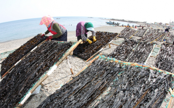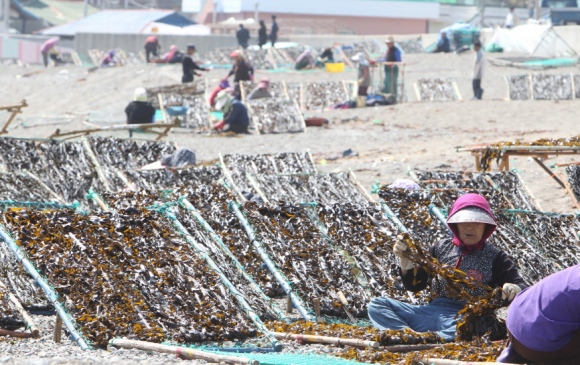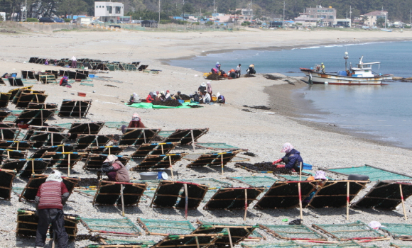 15일 오후 포항시 남구 장기면 신창리 해안에서 어민들이 따뜻한 봄 햇살 아래 제철을 맞은 미역 건조 작업을 하고 있다.