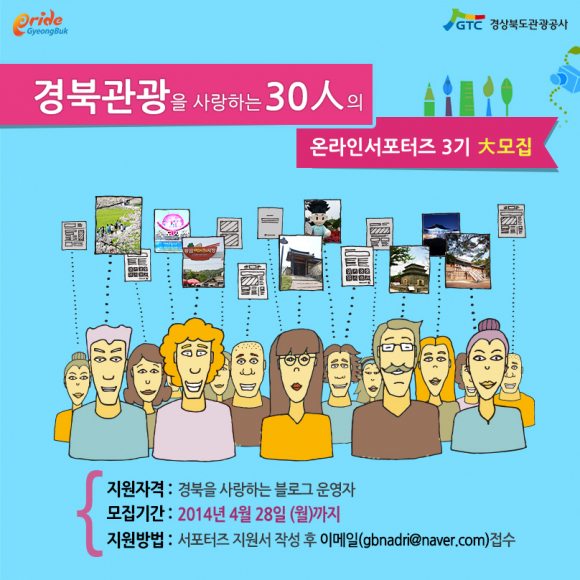 경상북도관광공사는 경북관광의 SNS 마케팅을 활성화하고 경북의 우수관광자원을 홍보하기 위하여, 제3기 경북관광 온라인서포터즈 30명을 모집한다.