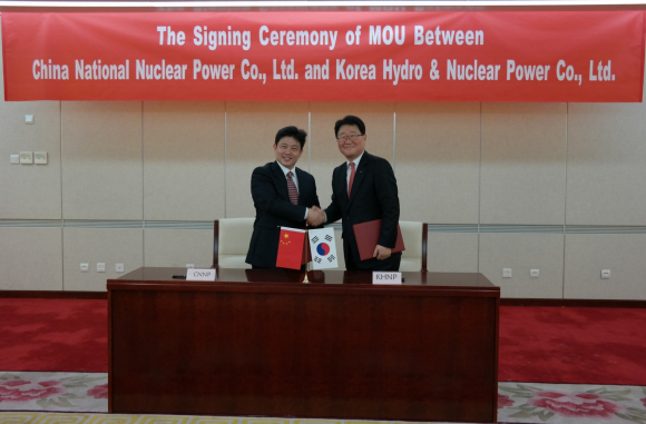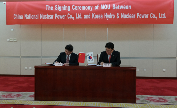 |  | | | ↑↑ 조석 한수원 사장(오른쪽)이 18일 Chen Hua 중국 CNNP 사장(왼쪽)과 기술․인력․정보교류 등을 주요 내용으로 하는 MOU를 맺고 서명하고 있다. 한수원은 21일 일본 간사이전력과도 MOU를 맺는 등 한·중·일 동북아 3국 원전운영사간 공조체제를 긴밀히 구축했다. | | ⓒ GBN 경북방송 | |