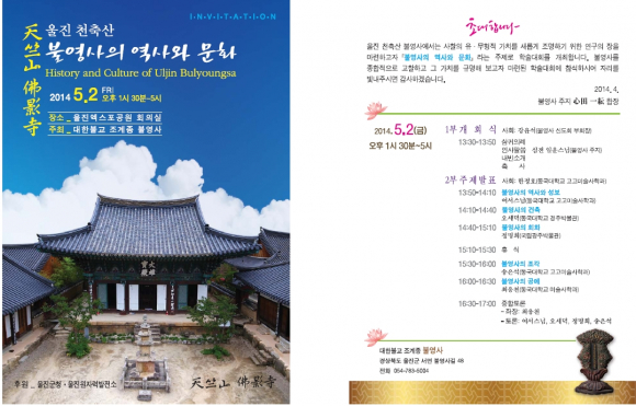일 시 : 2014년 5월 2일 금요일 오후 1시30분 ~ 5시 장 소 : 울진엑스포공원 회의실 주 최 : 대한불교 조계종 불영사 후 원 : 울진군청, 울진원자력발전소