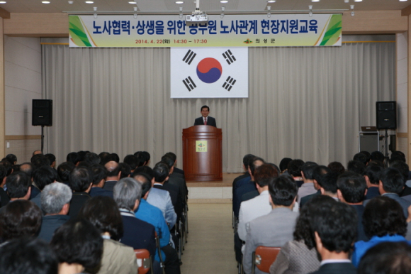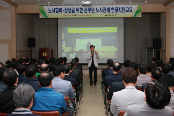 노사관계교육은 22일 오후 2시30분부터 5시30분까지 3시간동안 군민회관 대강당에서 6급이상 중견간부 공무원 등 300여명을 대상으로 실시했다. 이번 교육은 한국기술교육대학교 고용노동연수원의 현장지원과정의 일환으로 근로기준법 등 개별 노사관계 법령 해설을 주제로 진행되었으며 노동법 분야 전문가인 이공희 고용노동연수원 교수를 초빙하여 일선 현장의 사례 중심으로 발표하여 교육의 이해도를 높였다.