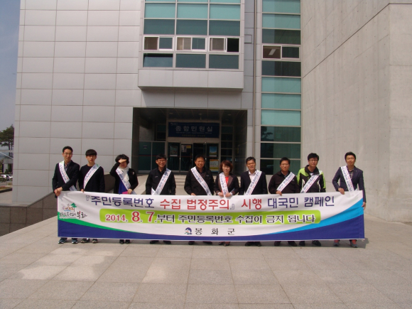 봉화군은 22일 개인정보 보호법 개정․시행(2014. 8. 7.)에 따른 주민등록번호 수집금지 홍보 및 개인정보 보호법 준수를 유도하기 위해 시장 및 버스터미널 등 주요 거점지역에서 군민, 기관․단체․사업자를 대상으로 홍보 캠페인을 실시했다.