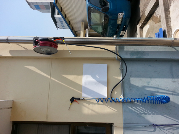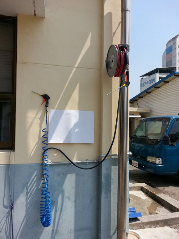 읍에서는 4월초 자제보유하고 있는 각종기계‧장비의 유지관리를 위하여 설치한 공기압축기를 응용하여 농촌지역 특성상 흙먼지가 묻은 채로 읍사무소를 찾는 민원인이나 현장 확인이 많은 부서 직원들을 위하여 설치하므로 주민들의 편익과 사무실의 쾌적한 환경을 제공하게 되었다.