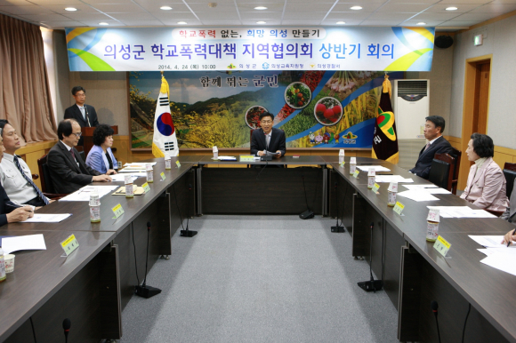 의성군은 지속적인 예방활동과 홍보에도 불구하고 나날이 늘어나고 있는 학교폭력의 근원적인 해결책을 강구하기 위하여 관련 유관기관단체 등으로 구성 된 의성군 학교폭력대책 지역협의회(위원장 김병삼 부군수) `14년 상반기 회의를 4월 24일 군 영상회의실에서 개최했다.