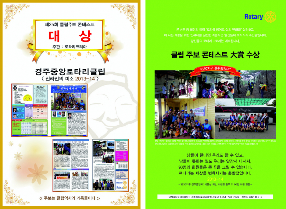 경주중앙로타리클럽(회장 박문상)은 국제로타리 산하 (사)로타리 코리아에서 주관한 제25회 전국 클럽 주보 콘테스트(5월9일 시상)에서 영예의 대상을 수상했다.