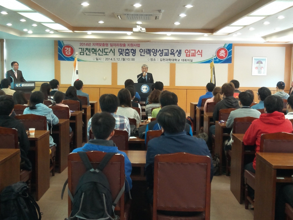 |  | | | ⓒ GBN 경북방송 | | 김천시는 지난 12일 김천과학대학교 대회의실에서 혁신도시 이전공공기관 및 협력업체에 안정적인 인력 수급과 지역의 젊은 인재들의 역외 유출 방지 등 지역의 고용안정화를 도모하기 위하여 “김천혁신도시 이전공공기관 맞춤형 인력양성사업” 입교식을 가졌다.