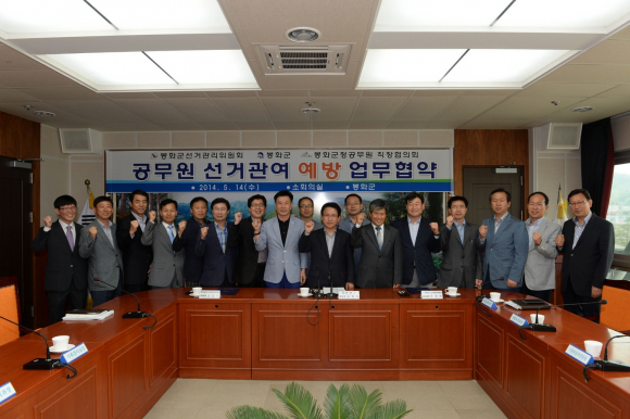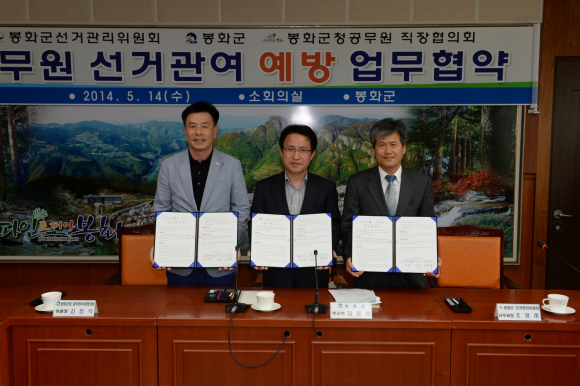 봉화군(군수 권한대행 부군수 김원석)과 봉화군공무원직장협의회(위원장 김창식), 봉화군선거관리위원회(사무과장 조광래)에서는 14일 오전 9시에 군청 소회의실에서 공무원의 선거관여 예방 등을 위한 3개 기관단체 합동 업무협약을 체결했다.