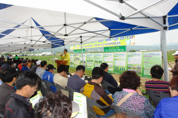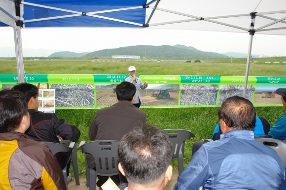경주시농업기술센터(소장 이태현)에서는 경상북도농업기술원과 공동으로 최근 몇 년 간 가을철 잦은 강우와 볏짚 수거 작업이 늦어져 청보리, 호밀 등 동계사료작물을 파종하지 못하거나, 파종 후 생육상태가 불량하여 농가들이 많은 어려움을 겪고 있어 이를 해결하고 생산성을 높이기 위하여 2013년 9월 24일 강동면 오금들 (강동면 오금리 285번지) 10㏊에 무인헬기를 이용한 IRG(이탈리안라이그라스) 벼 입모 중 파종 시험을 추진하여 14일 평가회를 개최했다,
