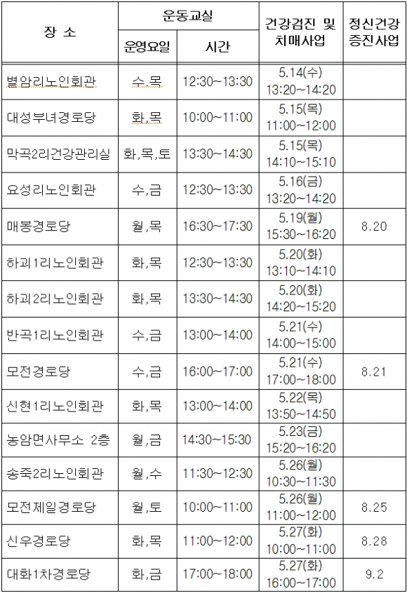운동교실은 주 2회씩 전문체조강사가 방문하여 노인들이 쉽게 따라할 수 있는 스트레칭 등 운동 프로그램을 운영하고, 만성질환 관리를 위해 고혈압, 당뇨검사도 실시한다. 또한 치매선별검사를 실시하여 인지저하자는 정밀검진을 의뢰하고, 노인우울증검사 및 자살예방상담을 통하여 노년기의 우울과 불안증을 극복하고 즐거운 노후생활을 영위하도록 돕고 있다.