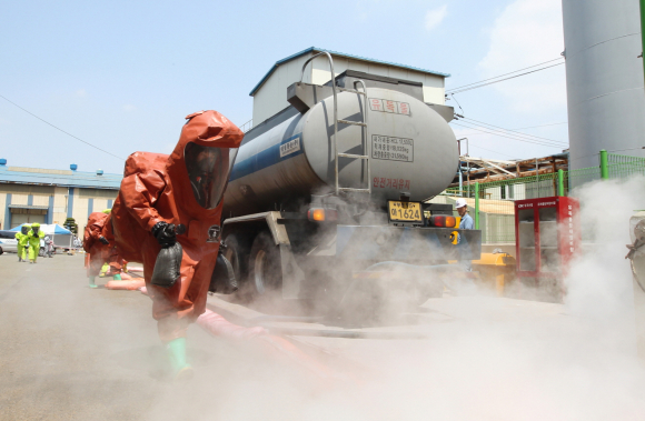 훈련은 염산 하역장소에서 운반차량의 하역작업 중 연결배관 체결부위가 해체되면서 염산이 외부로 유출되는 훈련사항을 가정해 실시했다.