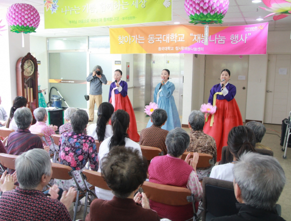 이번 봉사활동은 동국대 경주캠퍼스 학생홍보대사와 한국음악과 학생 등 40명이 노인 전문 요양원인 불국성림원을 찾아 시설 청소와 정리, 말벗 봉사 등의 활동과 한국음악과 학생들의 국악 공연 및 부채춤 공연 등의 재능 기부 활동을 펼쳤다.