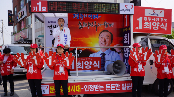 새누리당 경주시장 후보 최양식은 이른 아침 용강네거리에서 아침 인사로 하루를 시작했다. 곧 입실과 안강을 찾아 지지를 호소했고, 오후엔 경주시내 일원 거리 유세와 시각 장애우들의 모임에 참석했다.