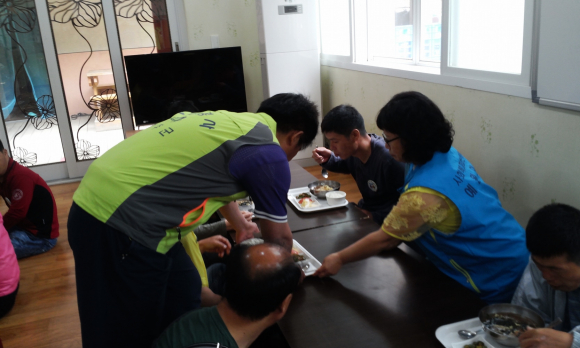 장애우들이 편하게 식사를 할 수 있도록 배식을 돕고 설거지, 배수구청소 등 바쁜 복지사들의 일손을 거들었으며 치약, 칫솔, 휴지, 수건 등 위문품을 전달하고, 격려를 통하여 따뜻한 정을 나누는 시간을 가졌다.