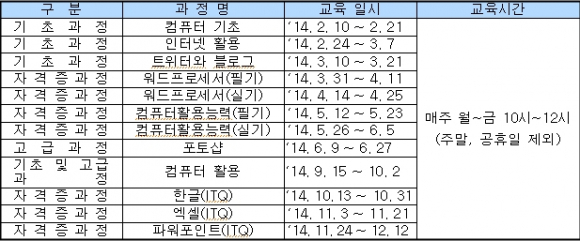 모든 과정은 무료로 실시되며 기초과정부터 고급과정, 자격증 취득과정까지 수료하면 컴퓨터 운용 및 자격증취득을 위한 정보능력을 갖추도록 내실 있게 구성되어 있다.