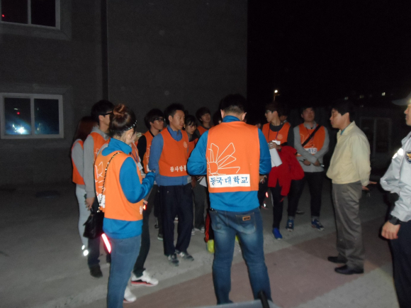 동국지킴이 학생순찰대는 부족한 치안인력을 고려, 경찰과 학계 협력을 통해 지역사회의 상호발전을 도모하기 위해 체결한 MOU의 후속 조치의 일환으로 일일 4~5명 1개조로 편성, 주 5회 21:00~01:00까지 석장동 여성안심구역 일대를 도보순찰 하면서 각종 범죄예방 활동을 하고 있으며,