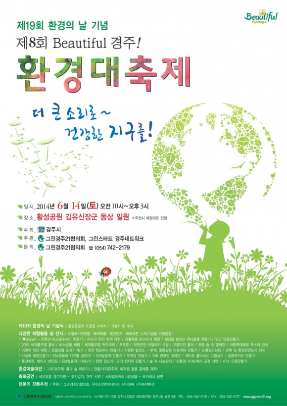 경주시는 오는 6월 14일, 오전 10시부터 오후 3시까지 황성공원 김유신장군 동상 일원(우천 시 예정대로 진행)에서 제18회 환경의 날을 기념하는‘제8회 Beautiful 경주! 환경대축제’를 개최한다.