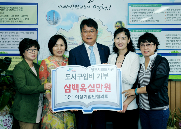지난 2일 여성기업인협의회 회원들은 영천시청을 찾아 도서구입비로 써 달라며 여성기업인협의회 명의로 100만원, ㈜동서웰빙제약(대표 최경자) 100만원, 화인산업(대표 한점옥) 100만원, 엘림우드락보드(대표 박영순) 30만원, 승리산업(대표 안영옥)에서 30만원을 기부했다.