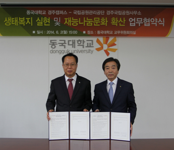 동국대학교 경주캠퍼스(총장 이계영)는 국립공원관리공단 경주국립공원사무소(소장 이수식)와 지난 2일 오후 3시 교내 백주년기념관에서 상호 업무 협약서를 체결했다.