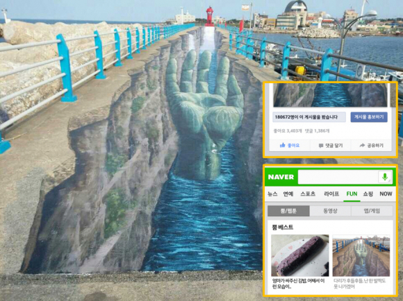 그리고 29일 급기야 포털 사이트 메인에까지 올라왔다. 대보항에 직접 가본 관광객이 트릭아트 사진을 올리자 포털에서도 재미있는 반응들이 올라왔다. “이번 여름은 포항으로 가자”라는 반응부터 댓글에도 대보항에서 친구들과 코믹하게 찍은 사진들이 올라왔다.
