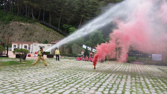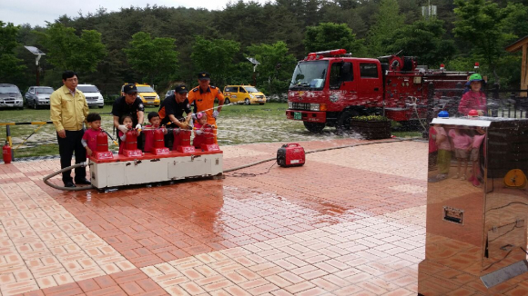 이번 훈련은 영주소방서 명호119안전센터와 합동으로 실시하였고, 이날 봉화목재문화체험장을 방문한 성곡어린이집 원아 51명이 함께 참여했다.