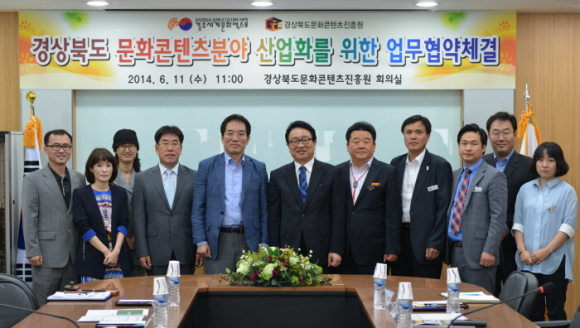 경상북도문화콘텐츠진흥원(원장 김준한)은 11일 오전 11시 경상북도문화콘텐츠진흥원 2층 회의실에서 경주세계문화엑스포(사무총장 이동우)와 ‘경상북도 문화콘텐츠분야 산업화’를 목적으로 업무 협약식을 가졌다.